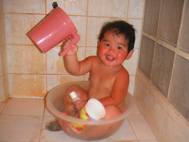 当時の部屋はバスタブなしのシャワーのみでした。よってごらんのような大きなボールが湯船でした。+サイパンの水道水は飲めません雑菌がすごいので皮膚の弱かったKohtaroには私は毎日1年半5リッターのボトル4本分の綺麗な水をもって帰り風呂に使ってました。重くて大変でした。